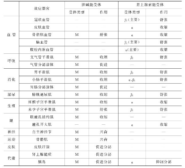 表10-4 胆碱能受体和肾上腺素能受体的分布及效应