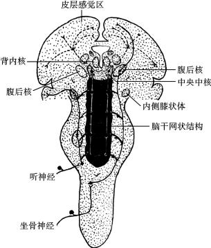 C.弥散性投射到大脑皮质广泛区域  D.对催眠药及麻醉药敏感