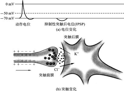 (2)抑制性突触后电位:其特征是突触后膜产生超极化。突触前神经元释放抑制性递质,当递质与受体结合后,可增大突触后膜对Cl-和K+的通透性,其中主要是Cl-的通透性,即引起Cl-内流,使突触后膜发生超极化(图10-5),该突触后神经元的兴奋性下降,这种电位变化称为抑制性突触后电位(inhibitorypostsynapticpotential,IPSP)。
