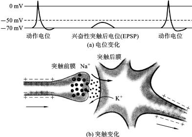 当突触前神经元的兴奋传到神经末梢时,突触前膜发生去极化,当去极化达到一定水平时,突膜前膜上电压门控Ca2+通道开放,细胞外Ca2+进入突触小体,使突触小泡向突触前膜移动,突触小泡与前膜融合,结果引起突触小泡内神经递质的释放。通过出胞作用,神经递质释放入突触间隙后,经扩散抵达突触后膜,与突触后膜上特异性的受体结合,引起突触后膜对某些离子通透性的改变,使某些带电离子进出突触后膜,突触后膜即发生一定程度的去极化或超极化。这种发生在突触后膜上的电位变化称为突触后电位。如果神经递质是兴奋性的,则引起突触后神经元兴奋。如果神经递质是抑制性的,则引起突触后神经元抑制。因此,可将突触后电位分为兴奋性突触后电位和抑制性突触后电位两种。