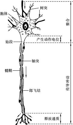 神经系统主要由神经细胞和神经胶质细胞组成。神经细胞又称为神经元(neuron),神经细胞是神经系统的基本结构与功能单位。虽然神经元形态与功能多种多样,但在结构上大致都可分为胞体和突起两部分(图10-1)。胞体包括细胞膜、细胞质和细胞核三部分,突起又分为树突(dendrite)和轴突(axon)两种。树突较粗短,每个神经元有一至数个树突,形如树枝状,树突表面一般有树突棘。树突的主要功能是接受刺激。轴突细而长,每个神经元只有一个轴突,胞体发出轴突的部位常呈圆锥形,称轴丘。轴突的主要功能是传导神经冲动和释放神经递质。轴突、长的树突及包绕在其外面的神经胶质细胞构成神经纤维(nerve fiber)。习惯上根据髓鞘的有无,将神经纤维分为有髓神经纤维与无髓神经纤维两种。