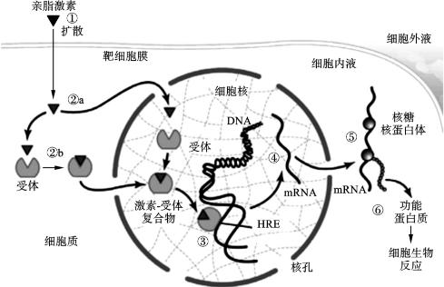 类固醇激素作用的机制,即基因表达学说认为,类固醇激素相对分子质量较小,脂溶性较高,到达靶细胞后可透过细胞膜。进入细胞内的某些激素,如糖皮质激素,先与细胞质内的特异受体结合,形成激素-受体复合物,导致受体蛋白结构改变而增强激素-受体复合物对染色质的亲合力,从而使激素-受体复合物容易透过细胞核膜进入细胞核内,并与激素反应元件结合,形成激素-受体复合物,进而启动特异性基因转录,促进特异性mRNA生成,诱导蛋白质或酶蛋白合成,发挥特定的生理功能。还有的激素(如性激素)进入细胞内,可直接穿过细胞核膜进入细胞核中,与细胞核中的受体结合,调节基因表达。糖皮质激素可不通过基因调节机制,作用于细胞膜而发挥生理效应,也可直接作用于靶细胞溶酶体,使溶酶体膜稳定而不易破裂。激素的作用机制是非常复杂的,如甲状腺激素虽属含氮激素,却易透过细胞核膜直接进入细胞核内,通过基因表达发挥调节作用。