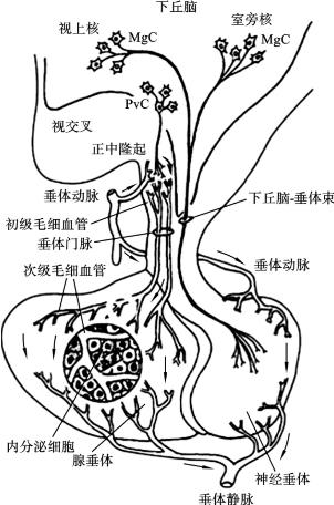 位于下丘脑前部的视上核、室旁核既有典型的神经元功能,又具有合成、分泌血管升压素和催产素的功能。其轴突构成下丘脑-垂体束,不仅传导冲动,而且经轴浆运输将这两种激素运至神经末梢,并在神经垂体部位储存。当这些神经元兴奋时,神经垂体将激素释放入血液,因此,可将神经垂体视为下丘脑的延伸部分,下丘脑与神经垂体在结构与功能上成为一体(图11-4)。