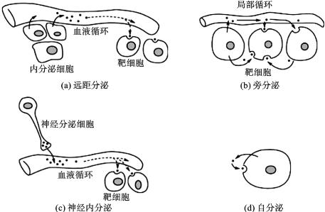 激素传递信息的方式有多种:大多数激素分泌后经血液运输至远距离的靶细胞或组织而发挥作用,这种方式称为远距分泌;有的激素分泌后可由组织液直接弥散于邻近细胞而发挥作用,称为旁分泌;下丘脑某些核团的神经细胞,不仅具有神经元的结构与功能,而且还兼有合成与分泌激素的功能,这些神经细胞分泌的激素经神经纤维轴浆流动运送至末梢释放,这类细胞称为神经内分泌细胞,它们产生的激素称为神经激素,这种方式称为神经内分泌;激素也可以作用于分泌它的自身细胞,这种方式称为自分泌(图11-1)。