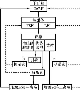 生殖功能是在下丘脑-腺垂体-性腺轴三级结构的调控下进行的。下丘脑分泌促性腺激素释放激素,通过垂体门脉系统到达腺垂体,控制腺垂体促性腺激素的分泌,促性腺激素再经血液循环到达性腺,调节性腺的活动。同时,性腺分泌的激素和腺垂体分泌的促性腺激素也具有反馈调节作用。
