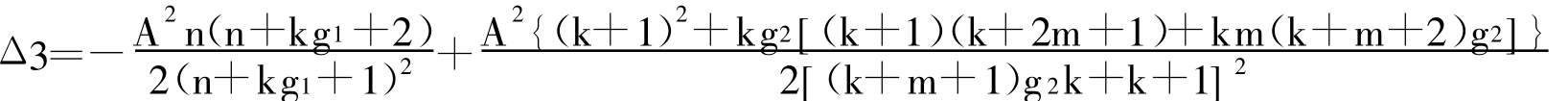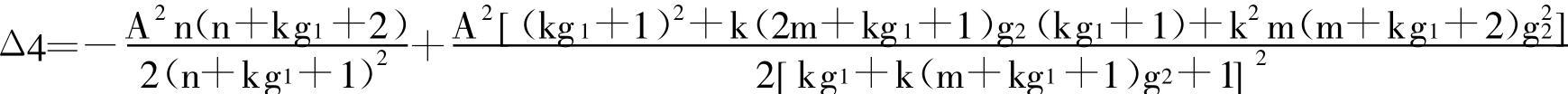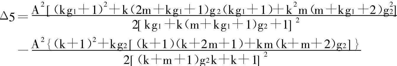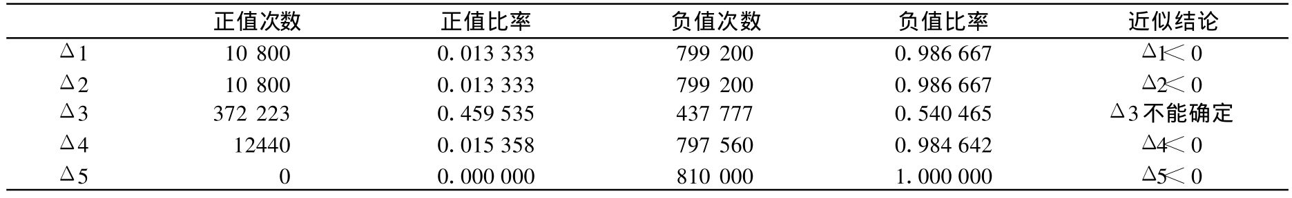 ②关于Δ1、Δ2、Δ3、Δ4及Δ5的符号判断见以下说明:由于Δ1、Δ2、Δ3、Δ4及Δ5的表达式较为复杂,不便得出直观的数理结果,故采用数值检验的方式确定其符号之正负。根据模型假定,通过以下步骤为各个变量取若干样本值点:令A =1(其不影响结果的正负);定义g1的取值区间为[1, 3] ,取值步长为0.1,即在取值区间[1, 3]内每隔0.1取一个样本值;定义g2的取值区间为[0, 3] ,取值步长为0.1;定义n的取值区间为[10, 5000] ,取值步长为100;定义m/n的取值区间为[0.1, 0.9] ,取值步长为0.1;定义k的取值区间为[0, 3] ,取值步长为0.1;如此,这些样本值点将产生8.1×105种组合,即每一个接受检验的变量(表达式)将有8.1×105个赋值。然后计算其中正值(负值)出现的比例,以作为其真实值为正(负)的概率的近似。经Mathematica 6.0运算得到结果如下: