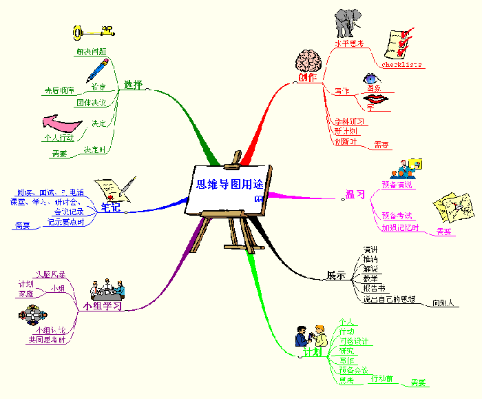 从思维导图的特点及作用来看,它可以用于工作、学习和生活中的任何一个领域里。