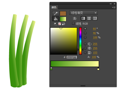 打开”颜色“面板,然后设置类型为”线性“,设置第一个色标颜色为(R:57,G:143,B:12);第二个色标颜色为(R:255,G:255,B:153),再用设置好的颜色填充芭蕉杆图形,效果如下图所示。