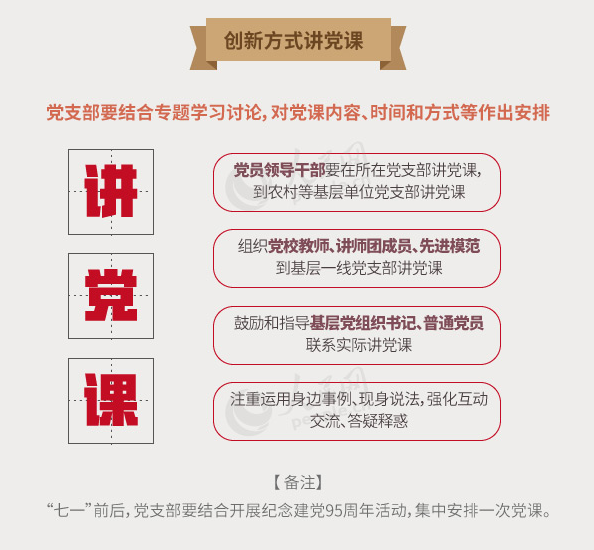 讲党课一般在党支部范围内进行。党支部要结合专题学习讨论,对党课内容、时间和方式等作出安排。党员领导干部要在所在党支部讲党课,到农村、社区、企业、学校等基层单位党支部讲党课。组织党校教师、讲师团成员、先进模范到基层一线党支部讲党课。要鼓励和指导基层党组织书记、普通党员联系实际讲党课。注重运用身边事例、现身说法,强化互动交流、答疑释惑,增强党课的吸引力和感染力。“七一”前后,党支部要结合开展纪念建党95周年活动,集中安排一次党课。