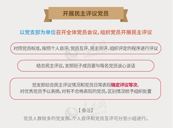 以党支部为单位召开全体党员会议,组织党员开展民主评议。对照党员标准,按照个人自评、党员互评、民主测评、组织评定的程序,对党员进行评议。党员人数较多的党支部,个人自评和党员互评可分党小组进行。结合民主评议,支部班子成员要与每名党员谈心谈话。党支部综合民主评议情况和党员日常表现,确定评议等次,对优秀党员予以表扬;对有不合格表现的党员,按照党章和党内有关规定,区别不同情况,稳妥慎重给予组织处置。
