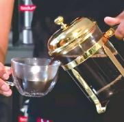 使用活塞壶法非常简单, 先用热水温壶,放入适量中度研磨咖啡粉。咖啡粉与水的比例是至少四尖茶匙咖啡粉对约半升水。倒入刚烧开的水,用一根木汤勺充分搅拌匀,用一保温套包住咖啡壶保温。让咖啡浸泡三五分钟,慢慢沉淀, 然后将带有滤网的活塞压到壶底,使咖啡粉末和泡好的咖啡分开。如果喜欢喝浓一点的咖啡,可以用四茶匙以上的咖啡粉,活塞式咖啡壶非常方便,仅次于滴滤式,是目前制作新鲜咖啡最流行的两种方法之一。便宜一些的咖啡壶用尼龙代替不锈钢做个滤层。你会发现,用活塞壶法可以很方便地处理掉咖啡残渣,使你得以充分享受百分之百的咖啡风味。它的另一个优点是可供选择的量很多,所以当你冲调早餐咖啡时,你不必使用八杯量的壶。它的唯一缺点是不能保温。