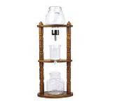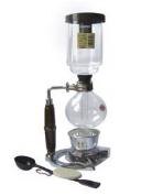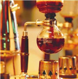 虹吸式咖啡壶一般由两个透明的玻璃半球上下组合而成,再加上使用了酒精灯,看上去很像是化学实验器具。在下半球中加入热水,在上半球中加入咖啡粉,点燃最下面的酒精灯。待水煮沸后,下半球的水上升至上半球,用调棒轻轻搅拌,使水与咖啡粉充分混合。再加热一会儿后关火,上半球中的咖啡液经过滤后,滴入下半球,咖啡就制好了。由于冲泡过程充满表演的乐趣,又能欣赏咖啡淬炼的过程,因此更能增添喝咖啡的气氛。
