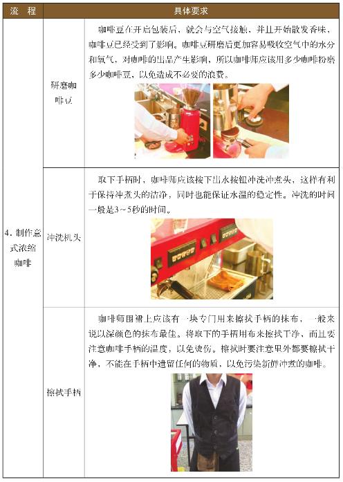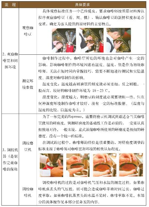 关于教:在实施任务时,教师可以根据教学的需要采用多角度的教学辅助工具,特别要注意对学生操作要点的回放和比较。教师在实操指导中可以通过观察咖啡汁流速、咖啡油脂以及品尝咖啡指出每一个学生在操作过程中存在的问题,也可以使用浓缩咖啡对照表辅助教学,教师还需要根据每一个步骤去寻找相关的教学资源。