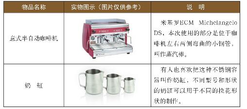 本次实操中,我们使用机器制作热奶泡的相关物品包括:意式半自动咖啡机、奶缸、温度计、6℃的全脂牛奶、干净的抹布、平滑玻璃咖啡杯等,相关图示请看下表。