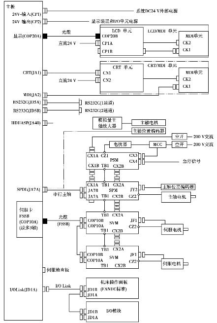 系统I/ O模块由系统电源板(为系统提供各种直流电源)、图形显示板(可选配件)、用于机床输入/输出控制的DI/ DO、系统视频信号接口、MDI键盘信号接口(JA2)、手摇脉冲发生器信号接口(JA3)、通信接口(JD5A,JD5B)组成。图3. 4为FANUC 0i A系统的构成。