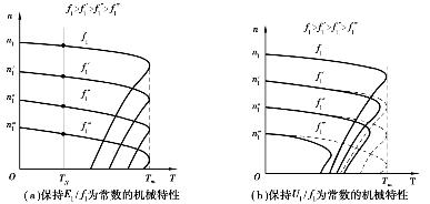 ①保持El/ f1为常数。降低电源频率f1时,保持El/ f1为常数,则Φm为常数,是恒磁通控制方式,也称恒转矩调速方式。降低电源频率f1调速的人为机械特性,如图6. 2(a)所示。