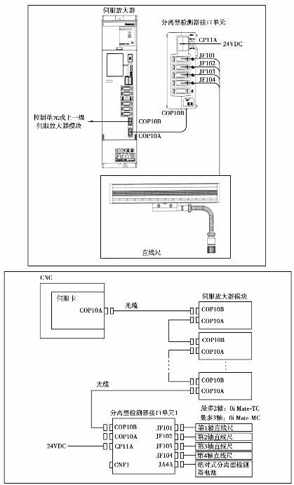 FANUC 0i C与0i B一样,经FANUC串行伺服总线FSSB,用一条光缆与多个进给伺服放大器(αi系列)相连。进给伺服电动机使用αis系列,最多可接4个进给轴电动机。