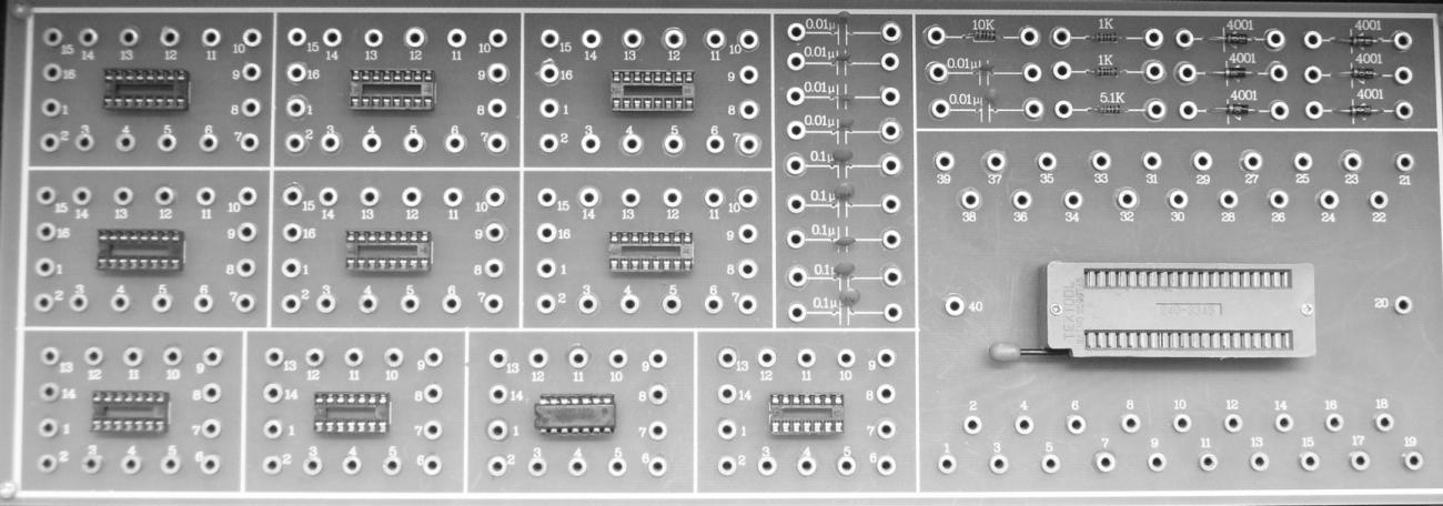 集成块插座区提供了19个芯片插槽,分别有8个14脚的,5个16脚的,2个8脚的,2个20脚的,1个24脚的和1个28脚的。不同引脚数的集成块应对应插入不同的插座中,每一个插座的周围都有与引脚数相同的导线插孔,以便实验时进行必要的连线。