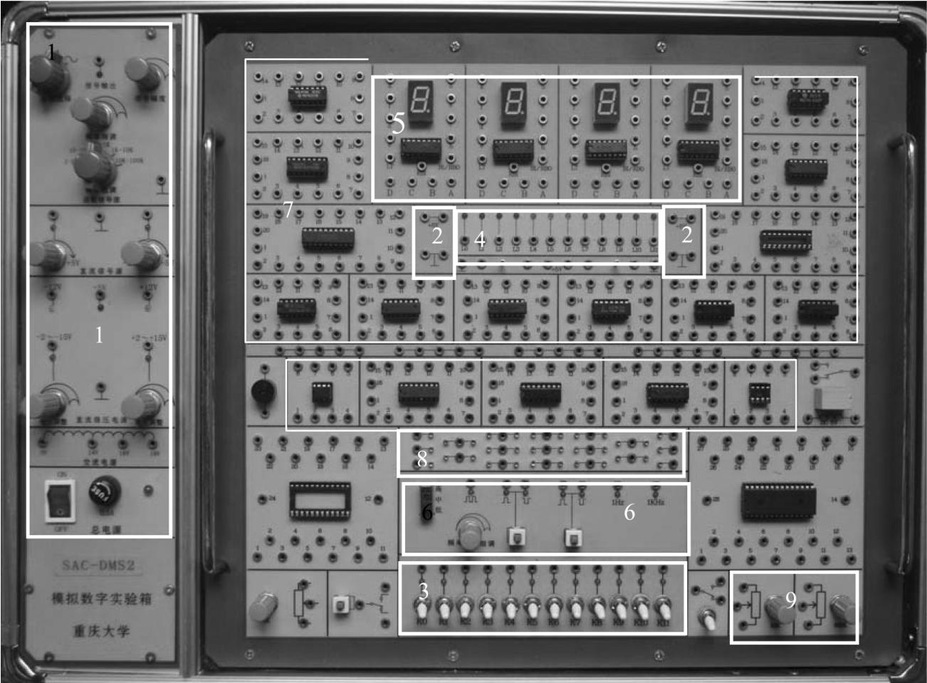 SAC-DMS2型模拟数字电子技术实验箱是由沈阳沈飞电子科技发展有限公司和重庆大学合作开发的产品。如图1.1所示为实验箱面板的照片。在图1.1中,根据功能的不同用实线将面板大致划分了10个区域,它们分别为电源及信号源区、实验板+5 V电源区、12位拨码开关区、12位LED电平显示灯区、数码管显示区、脉冲信号区、集成块插座区、针管座区、可变电阻区及扩展板区。下面分别对不同区域进行说明。