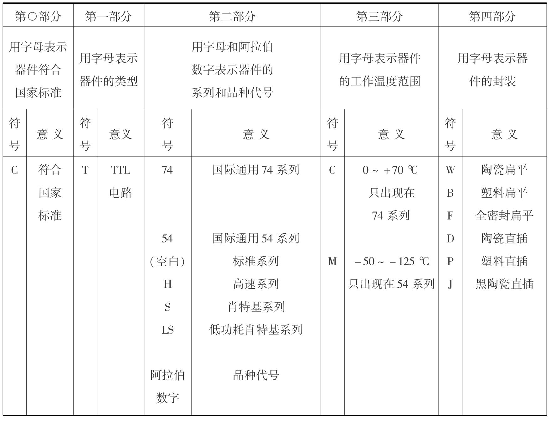 我国的CT54/74系列与国际54/74系列完全一致。CT54/74系列TTL电路(以下简称器件)型号的各组成部分的符号及意义如下: