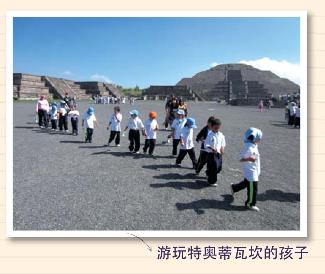 在特奥蒂瓦坎,我们也看到许多墨西哥小学生在上“人类学和国家历史课”,废墟因为有了孩子们的欢声笑语和奔跑嬉戏而有了勃勃生气。他们带着不同颜色的帽子,以表明来自不同的学校。我们出国旅游最养眼、最舒服和最温情的景色之一,就是各国孩子的笑脸和友好的问候,与他们的合影也是我们最珍爱的。