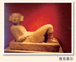 玛雅人重视52年为一个轮回年,迎新年要出新。考古人员据此,推测玛雅人会用新建金字塔覆盖老金字塔,果然在库库尔坎金字塔肚子里又发现了小金字塔。入内可见獠牙外露的红色美洲豹石雕,玛雅人非常崇拜美洲豹。还有一座叫“查克莫尔”的人形石雕,一个人半坐半仰于地,头扭向一侧,双腿上屈,双手置于胸前,捧着一个用来盛放人心等祭品的托盘。“查克莫尔”就是玛雅语的“大红美洲豹”。