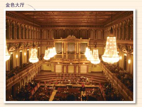 还有,大厅内有几十座镀金的女神立像。其实,金色大厅不是一座独立的建筑,而是音乐协会大楼的一部分,该建筑物中有多个音乐厅,除金色大厅外,还包括勃拉姆斯厅和莫扎特厅等演出大厅,以及办公室。