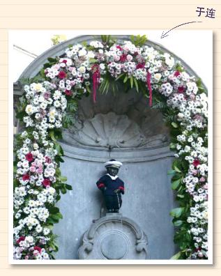 在大广场北面的埃杜弗小巷内,有一尊作撒尿状的小男孩铜像,他就是驰名世界的“布鲁塞尔第一公民”。关于该雕像的传说有好几种,其中流传最广的说法是:在比利时反侵略战争期间,战败的西班牙人在逃离该市时,点燃了火药库的导火索,企图将布鲁塞尔夷为平地。这位叫于连的小男孩发现了正在燃烧的导火索,他急中生智,撒了一泡尿,浇灭了导火索,救了布鲁塞尔,可于连却中弹身亡。人民为纪念这位小英雄而创作了此尊铜像。另一种传说是,中世纪,有一伙强盗在布鲁塞尔燃起漫天大火,此时有位神童从天而降,撒了一泡尿,将大火浇灭,人们建铜像纪念。于连的塑像生动逼真,他叉着腰,挺着肚,撒不完的尿。每年狂欢节时,于连的尿就不是自来水了,而是啤酒,引来人们争先狂饮。不知何时开始,访问比利时的各国政要都乐意向于连赠送一套有自己国家特色的小衣服,日积月累,越来越多,现在专门有一所“于连服饰博物馆”,收集和展示这些多姿多彩的民族服饰。于连还有一套中国服装呢。