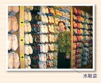 “风车村”的一个标志物是一只5米多长的大木鞋,孩子可躺在里面,大人也可坐在鞋内照相。大木鞋后面是一家木鞋作坊。以前,荷兰是“低洼之国”,冬天寒冷潮湿,穷人买不起鞋子,便用木头制成木鞋,放上稻草,可隔湿保暖。直到今天,许多荷兰农民和渔民仍有穿木鞋的习惯。但城市中穿木鞋的人已不多了,它毕竟笨重坚硬,可木鞋制作技术并没有失传,还在式样、色彩和用途上玩出更多花样,如成为装饰品,我们在荷兰看到,住宅、商店、公园、广场等都摆放着大大小小的木鞋,大多作为花盆,里面种着郁金香。木鞋也成了荷兰最大的工艺品和旅游纪念品之一。