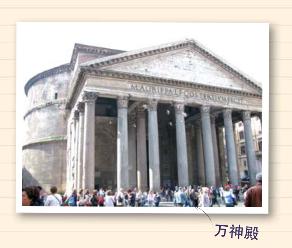 是至今完整保存的唯一一座罗马帝国时期的建筑,始建于公元前27—25年,用以供奉奥林匹亚山上诸神,是奥古斯都时期的经典建筑。公元80年的火灾,使万神殿的大部分被毁,仅余下长方形的柱廊,有12.5米高的花岗岩石柱16根,这一部分被作为后来重建的万神殿的门廊。在万神殿里,埋葬着一些伟大的意大利艺术家,其中最重要的人物是拉斐尔。在拉斐尔的墓上,是他的弟子所作“巨石圣母”雕像。
