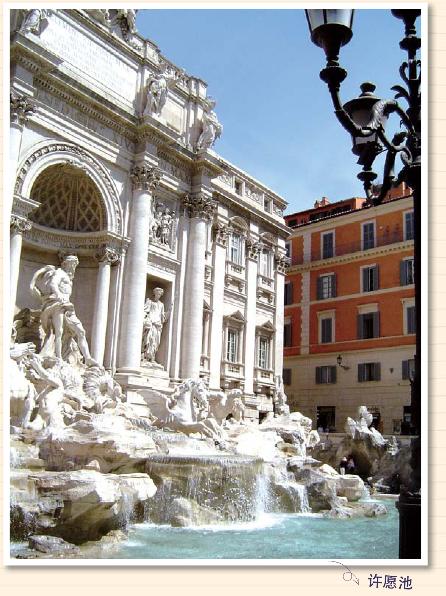 罗马有许多历史悠久的喷泉,如纳沃纳广场就拥有3座著名的喷泉:四河喷泉的四座雕像分别代表尼罗河、恒河、多瑙河、拉布拉多河;还有尼普顿喷泉和摩尔人喷泉。可许愿池在1762年才建成,却知名度最高,最得游客的欢心。这是因为所有到罗马的人,很快会听到一个美丽的传说:游客只要背对着许愿池,右手拿硬币越过左肩抛入池中,便可以重返罗马;用同样动作抛3次硬币,第一枚是代表找到恋人,第二枚代表彼此真心相爱,第三枚是婚姻成功,并夫妻双双重返罗马。这对于年轻游客,特别是情侣,更有吸引力。