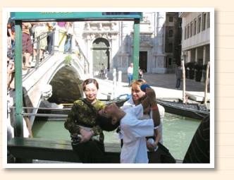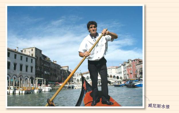 我们看到的贡多拉船夫个个都是意大利帅哥或帅叔,他们穿着统一的黑白或红白相间横条紧身短袖上衣,有些像水手的“海魂衫”,或白色的短袖制服,突露出结实肌肉的轮廓。他们站在船尾上,优哉游哉地划着桨,在威尼斯曲曲折折的水道中游弋。会船时,两位船夫放声歌唱,用美声彼此打招呼问候。为我们撑船的船夫是一位年轻小伙,相貌俊朗,热情奔放,一路歌声不断,笑声朗朗。