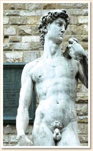 乌菲兹美术馆不远处就是米开朗基罗广场,广场中央有米开朗基罗的雕塑《大卫》的复制品,《大卫》的身后是一座具有浪漫主义风格的教堂。《大卫》真品现藏于佛罗伦萨美术学院。《大卫》创作于公元1501—1504年,被认为是西方美术史上最值得夸耀的男性人体雕像之一。像高2.5米,连基座高5.5米,用整块大理石雕成。大卫是《圣经》故事中的人物,他容貌俊美,机智勇敢,以他的赫赫战功,受到人民的拥戴,成了以色列最年轻的军事统帅。前人在塑造大卫时,常采用他取胜时的情景。米开朗基罗独具匠心,塑造了一个怒目而视,准备战斗的全裸青年大卫,表现出大卫渴望投入战斗的紧张情绪和坚强意志。《大卫》的全身肌肉暴起,手臂上血脉贲张,形同真人。后来,全世界对《大卫》的解读,早已脱出了宗教故事的范围,成为人们从黑暗思想桎梏中挣扎和解脱的象征,是人类思想解放诉求的艺术表达。