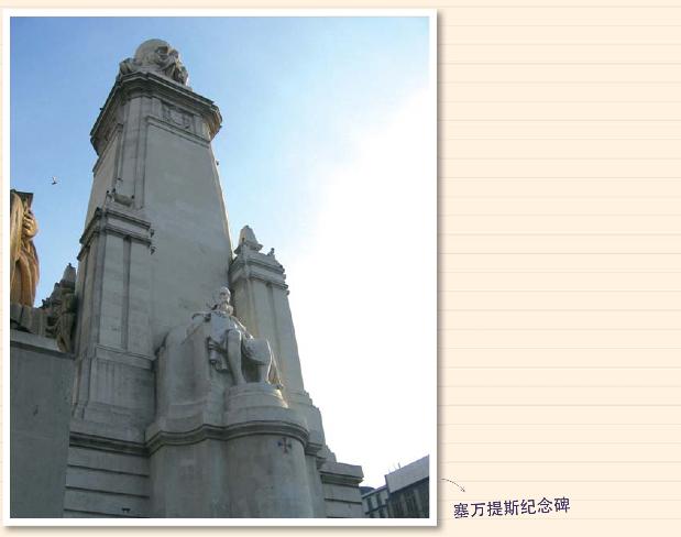 塞万提斯可能想不到,除了《唐吉诃德》成了世界名著以外,他本人、《唐吉诃德》中的唐吉诃德和仆人桑丘,还有阿尔卡萨尔镇,现在都成了西班牙旅游的卖点和丰富多彩的旅游产品,造福于他的同胞。马德里巍峨的西班牙皇宫对面是西班牙广场,广场正中央耸立着塞万提斯纪念碑。塞万提斯披着16世纪的披风,坐在太师椅子上,他失去的左臂被巧妙地掩在披风的里面,右手则握着他的巨著《唐吉诃德》。纪念碑前是唐吉诃德铜像,骑在马上的唐吉诃德,削瘦而坚定,手持着那根“地球人都知道”的长矛,眼光望着前方,似乎在寻找“风车”作战,可眼前只有那林立的大厦;他身边是骑驴的忠实仆人——桑丘,他目光茫然,与他主人的“无视社会现实”相反,桑丘成了全世界“实用主义”的代名词。在纪念碑塑像的两侧,还有两座角碑,上面是暗红色大理石雕像,唐吉诃德身旁是他臆想中的公主杜尔西尼娅,桑立的身旁是他的妻子乡村妇女阿尔东萨。小说中的两个次要人物陪着主人公,以揭示《唐吉诃德》空想与现实对立和矛盾的主题思想,显示了设计师和雕塑家丰富的想象和构思的巧妙。