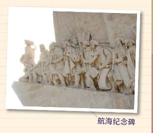 记载着葡萄牙昔日航海家们征服海洋的梦想。在人类航海的历史上,从达·伽玛、奥维士,到麦哲伦、哥伦布,都是从葡萄牙实现他们航海远洋及发现新大陆的梦想的。纪念碑就像驶向大西洋的古老帆船,立于船头的是当年葡萄牙国王的第四个儿子亨利亲王,正是他让人们相信,世界远比欧洲和地中海大得多。站在亨利亲王后面的是发现欧洲至印度航线的达·伽玛,而位居第四、手里拿着地球仪的则是哥伦布,虽然他是西班牙人,却是在葡萄牙学会航海技术的,当他发现美洲新大陆返航后终于在里斯本登陆时,立即轰动了整个欧洲。纪念碑前的广场,用黑白相间的大理石铺成了一幅巨大的世界航海图,它记述了当年葡萄牙人航海探险、发现新大陆的历史。