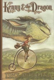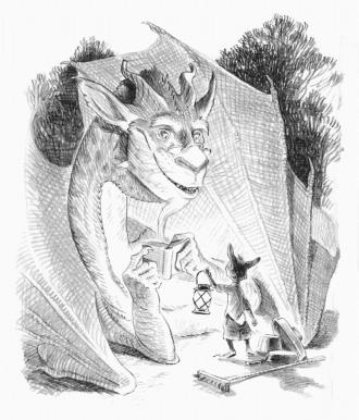 美国作家汤尼•迪特利齐自写自画的《肯尼和大怪龙》,其实是一本向格雷厄姆致敬的书。他几乎原封不动地照搬了《骑士降龙记》的情节,人物也一个不多一个不少,只不过是把他们全部都换成了动物——小男孩变成了兔子肯尼,照样是一个爱读童话和自然常识书的孩子;骑士乔治的变化大一点,变成了一只老獾,在小镇上开了一家书店。龙没什么太大的改变,如果一定要说有什么改变,那就是除了爱作诗,他还爱读书了,爱吃蛋奶酥、焦糖奶油一类的甜品了。对了,迪特利齐不只是把人物都换成了动物,还把故事的背景从“早年间”移到了现代。你看,兔子肯尼骑上了自行车,龙格雷厄姆看书时会戴上一副镜片跟晚餐盘子差不多大的金属边眼镜。