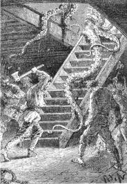 一根长长的触手立即像蛇似的滑进舱口,另有二十多根触手在舱口上面舞动。一斧头下去,尼摩艇长就把那根可怕的触手砍断,被砍断的触手沿梯级蜷曲着滑了下来。