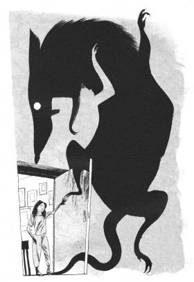 考罗琳是一个古灵精怪的小女孩。她发现她家住的这层公寓,一共有十四扇门,十三扇开着,一扇关着。关着的这扇门,是客厅最远角的一扇雕花的棕色木头大门,上着锁。她问妈妈:“它通向哪里?”妈妈回答她:“不通向哪里。”妈妈用一把最旧、最大、最黑、最锈的钥匙打开了那扇门,妈妈说得对,这扇门确实不通向什么地方,它只通向一面砖墙。