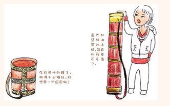 墙壁四周是满满的茶叶罐和酥油桶,每一个都做工精致,八角街上绝对买不到这样的东西,叫人不由得起了占有欲。其中最大的酥油桶和我的身高差不多,据说在法会的时候,年轻的奉茶僧就要用这样的木桶为聚集在大殿诵经的僧人们奉茶。我心中叹气,原来做僧人还要臂力惊人才行啊!