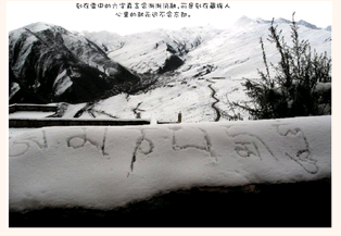 在甘丹寺中,我沿雪径爬上山腰,回望来时的茫茫雪山,忽见一处围墙上有人在雪中刻出字来,印痕颇深,凭直觉我想那一定是六字真言,翻出在山南拍下的照片对照,果然。我忍不住轻声诵念:“唵嘛呢叭咪吽。”
