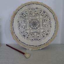 ④萨满鼓,又称抓鼓、手鼓、单环鼓。流行于满、蒙古、达斡尔、鄂温克、鄂伦春、赫哲等民族。圆盘形鼓面,蒙驴、马、牛、羊皮或鹿皮、狍皮,背面交错扎有皮带或铁条,上系10余枚铜钱。用时左手执皮带或铁条,右手执鼓槌,用槌头或槌身敲击。用于萨满教祭祀仪式。
