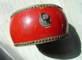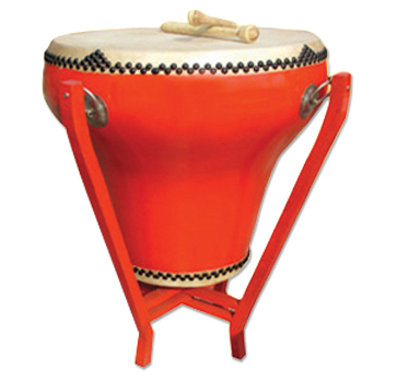 ①大鼓。乐队用的大鼓膜径约 50~100 厘米,上下蒙牛皮。平常置于鼓架,双槌敲击。用于器乐合奏及舞蹈 、戏曲的伴奏 。节日庆典用大鼓膜径100厘米以上 ,由1人或数人各执双槌击奏。