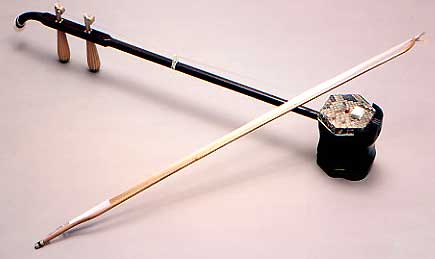二胡形制为琴筒木制,筒一端蒙以蟒皮,张两根金属弦,定弦内外弦相隔纯五度,一般为内弦定d1,外弦定a1,其演奏手法十分丰富,左手有揉弦(吟音)、泛音、颤音、滑音、拨弦等;右手有连弓、分弓、顿弓、跳弓、颤弓、飞弓、拨奏等。二胡一般定弦为d1、a1,有效音域达三至四个八度。