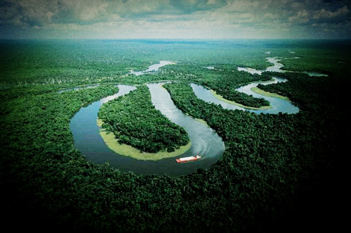 Because the Amazon drains the entire Northern half of the South American continent (approx. 40% landmass), including all the torrential tropical rains that deluge the rainforests, it carries an enormous amount of water. The mouth of the Amazon River, where it meets the sea, is so wide and deep that ocean-going ships have navigated its waters and traveled as far inland as two-thirds the way up the entire length of the river.