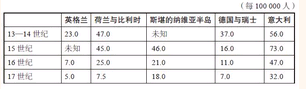 因此,通过一张错综复杂、扑朔迷离、不断调整且经济、社会和道德因素交织的网络,现代社会不遗余力地阻止犯罪蔓延。有人会说,效果并不理想,但从长期来看,事实显然并非如此。以历史上(排除战争时期)凶杀案案发率的变化趋势为例,凶杀案是数据统计最精确的犯罪类型,也是最能反映社会总体犯罪率的晴雨表。以下数据由犯罪学家曼纽尔·艾斯纳编纂,记录了欧洲五大地区的历史凶杀案案发率。