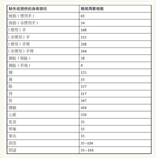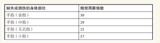 表4–2 康涅狄格州使用的各部位工伤赔偿表