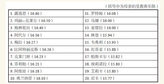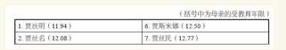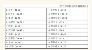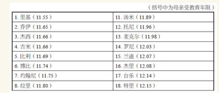 表6–16 “贾斯明”的各种拼法(按母亲教育水平由低到高排列)