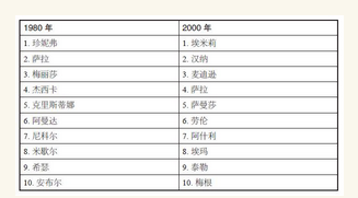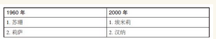 1960年的前10名中,没有一个名字留在前10。但你会说,40年不落伍是很难的事。那么,对比一下如今与仅仅20年前最热门的10个名字,结果会如何呢?