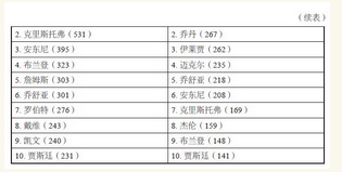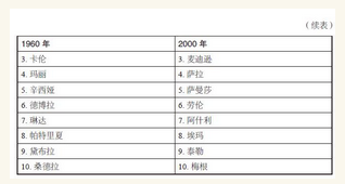 如果表6–20中有很多名字你不熟悉,不要觉得自卑,即便是向来少于女名的男名,数量也在猛增,言外之意,如今所谓最热门的名字普及度也不如过去的常用名。比如表6–21中,分别于1990年与2000年出生在加州的黑人男婴最常用的10个名字。1990年,共有3375名儿童取了排名前十的名字(在当年出生的儿童中占18.7)%,而在2000年,仅有2115名儿童取了排名前十的名字(在当年出生的儿童中仅占14.6)%。