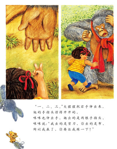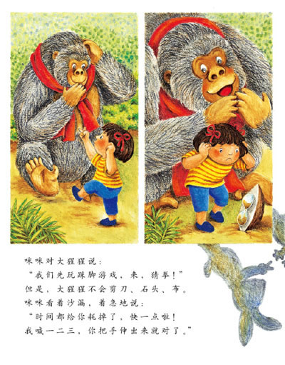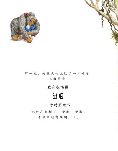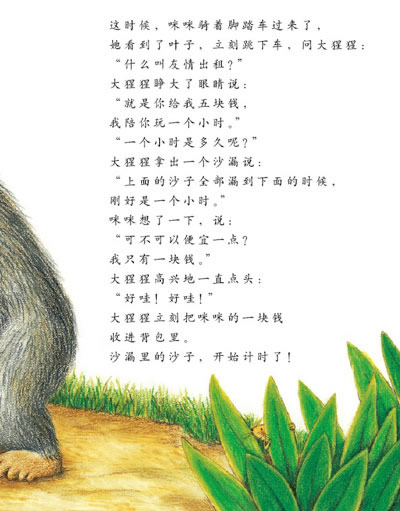 孤单寂寞的大猩猩不知道该怎样交朋友,于是想到了“出租友情”的点子,这样一来,不仅有朋友陪自己一起玩耍,而且还有钱赚,一举两得。刚巧,咪咪出现了,她正好没有玩伴,马上租下大猩猩陪自己玩,他们玩得很痛快。接下来,咪咪每天都来租友情,他们越玩越开心。这一天,大猩猩特地没带装钱的小背包和计时用的沙漏,反而准备了好吃的饼干要和咪咪分享,谁知咪咪却搬走了,留给大猩猩难忘的想念。后来,大猩猩又开始出租友情了,不过,这一次他特意强调了是“免费”出租,因为他已经领悟了友情的真谛,明白了友情是不能用金钱买卖的。